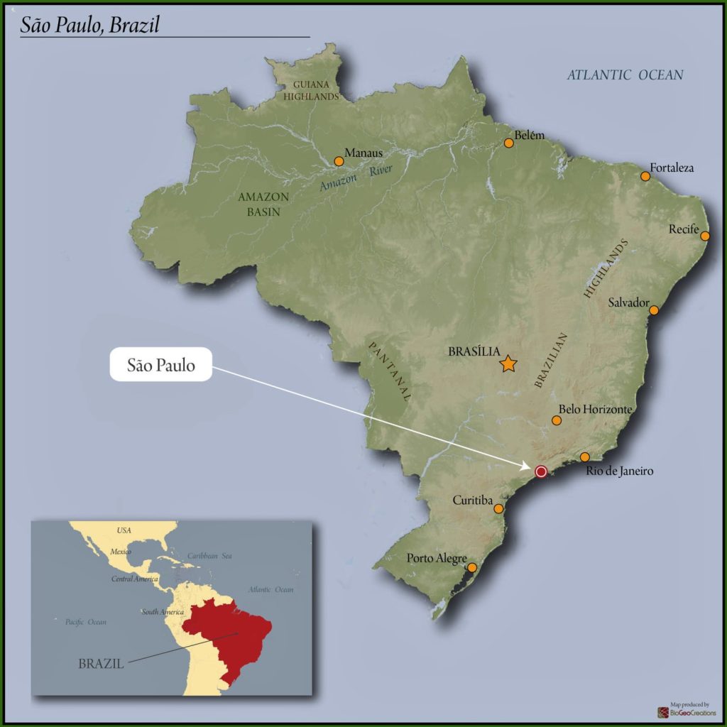 As the world's largest coffee producer, Brazilian lots often come from larger estates that use highly mechanized processing strategies to manage larger volumes.  The Mogiana region, split between the states of São Paulo and Minas Gerais, is the most renowned of three major Brazilian growing regions.  This region has rolling hills and uneven terrain lending to farms that are small to medium in size.